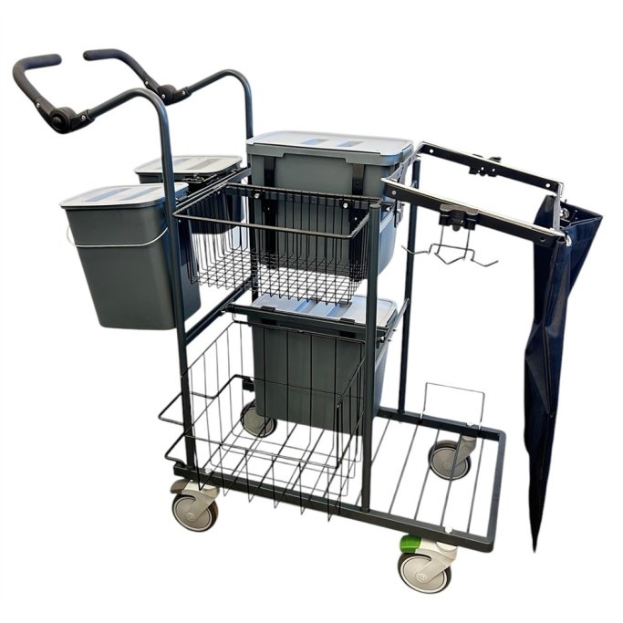 Med sitt gjennomtenkte design tilbyr vognen god plass til både rengjøringsmidler og avfallssortering.