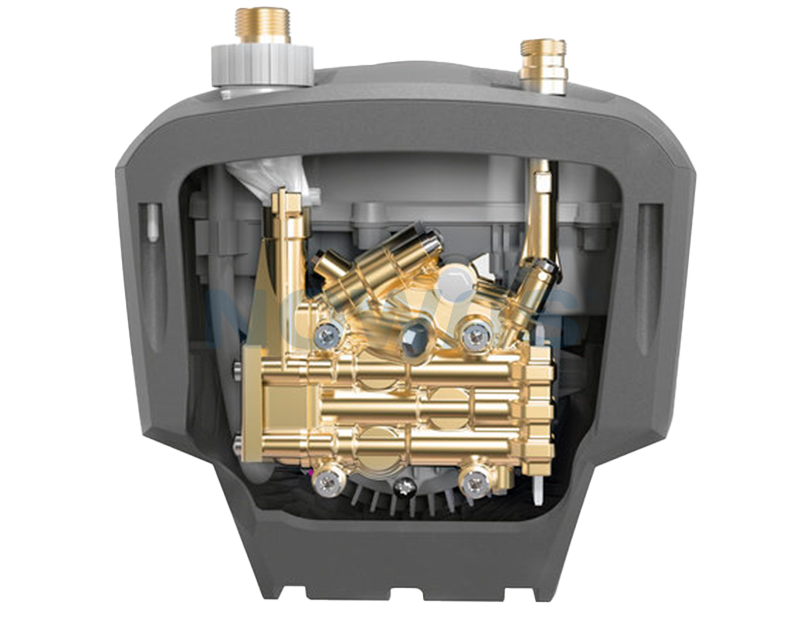 - Pumpeenhet med kraftig og robust 3-stemplet aksialpumpe med stempler i rustfritt stål, Trefas motor og veggoppheng for stasjonær bruk