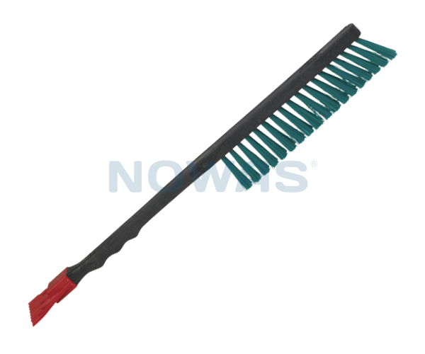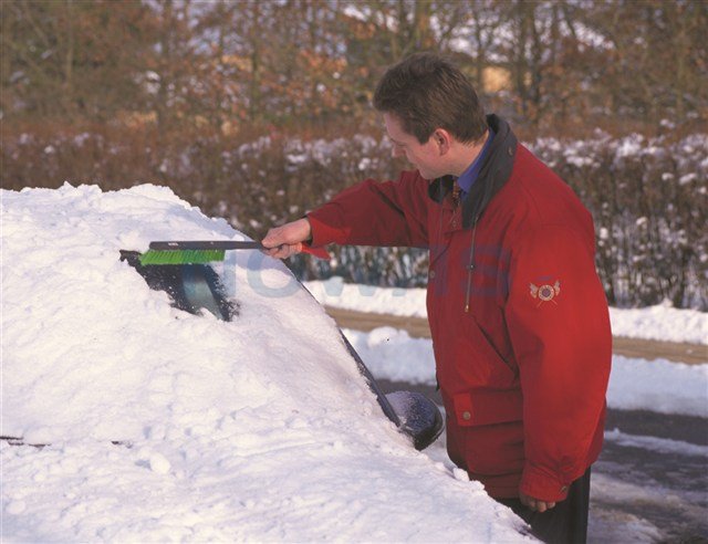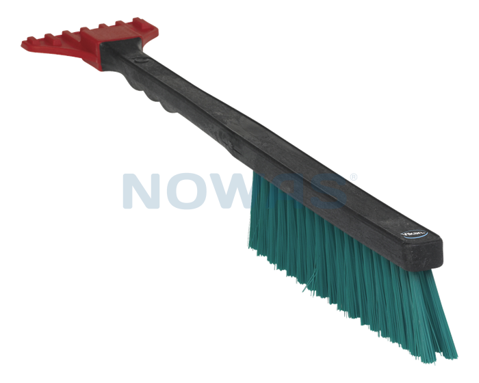 Auto Snøbørste med isskrape laget av svart polypropylen med grønne PVC filamenter.