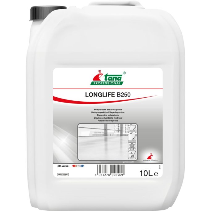 LONGLIFE B250 har flere forskjellige egenskaper som reduserer behovet for ekstra manuelt arbeid, tid og kostnader. LONGLIFE B250 danner et sklisikkert (i henhold til DIN51131), robust beskyttende lag med en lett silkemyk glans. Passer for alle vanntette gulv, spesielt når det kreves en sklisikker overflate. LONGLIFE B250 beskytter gulv mot slitasje og bidrar til å bevare de originale gulvene med kombinasjonen av rengjøring og pleie. LONGLIFE B250s spesielle formel er egnet for vedlikeholdsrengjøring og er enkel og rask å bruke. Sporadisk polering (400-1000 UPM) forbedrer utseendet og gjør den påførte beskyttelsesfilmen kompakt, noe som forlenger overflatens holdbarhet.