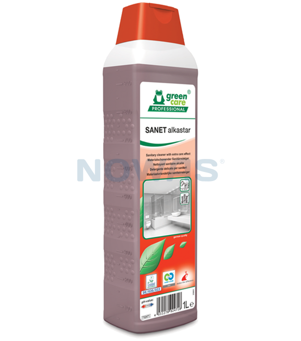 - SANET alkastar er et alkalisk sanitært pleierengjøringsmiddel, fritt for syre og klorin. Dette gjør produktet eksepsjonelt material- og miljøvennlig. Det respekterer biologiske syklus, tar hensyn til folks helse og rengjøringspersonellets sikkerhet.