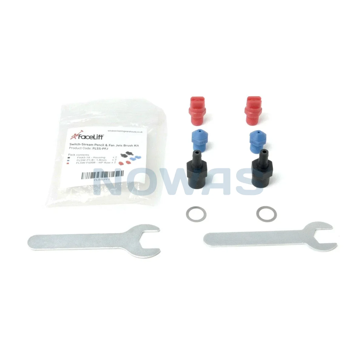Bytt mellom runde og viftestråledyser på sekunder. Oppgrader din eksisterende børste! FaceLift Switch-Stream er det ultimate 2-i-1-dysesystemet for vannbaserte børster, noe som gjør det enkelt å bytte mellom runde og viftestråledyser med en enkel vri.