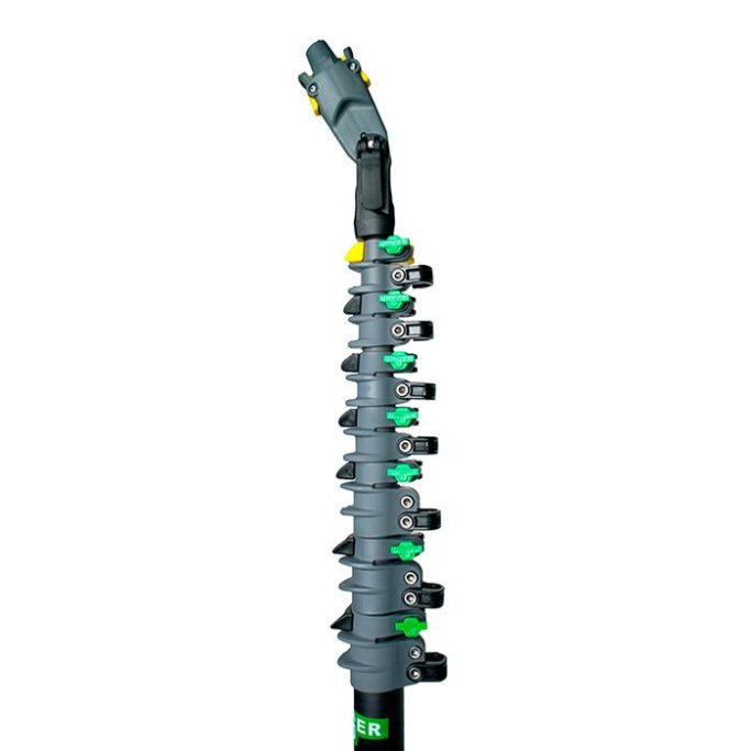Inkluderer vinkeladapter som passer til alle nLite vannførende børster. Har også en sikkerhetsstoppmekanisme for å forhindre utilsiktet separasjon av stangelementene.