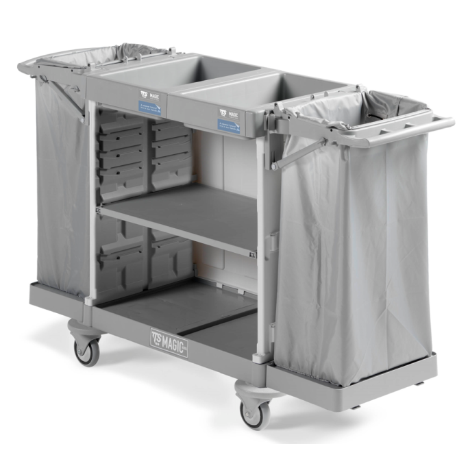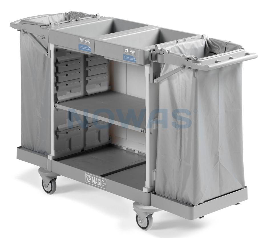 Praktisk og allsidig hotelltralle laget av slitesterk polypropylen. Vognen er modulær og kan tilpasses ulike rengjøringsoppgaver, noe som gjør den ideell for effektiv service på hoteller, institusjoner og større anlegg. Den sammenleggbare poseholderen gjør vognen spesielt egnet for mellomstore og større områder der plassen kan være begrenset. Når poseholderne er sammenslått, tar vognen mindre plass og er enklere å manøvrere og oppbevare. Vognen er også utstyrt med støtdempende kanter, som beskytter både vognen og omgivelsene mot mindre støt og riper.