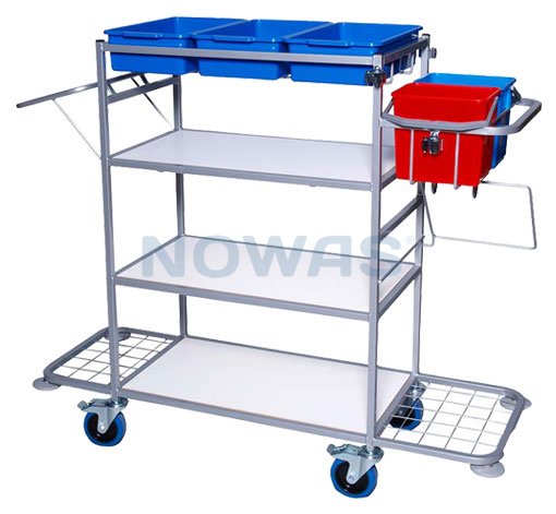 Denne vogn har plass til alt. Sengetøy, håndklær og mye mer. Videre har vognen 2 stk. 6 L. bøtter for støvtørking og holder for både avfall og brukt sengetøy. Utformet slik at du kan komme til fra begge sider.