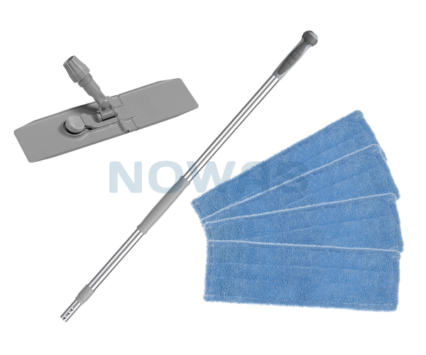 Komplett ergonomisk gulvrengjøringssystem med moppramme, ergonomisk teleskopskaft og 5 stk. Mikrofibermopper av topp kvalitet.