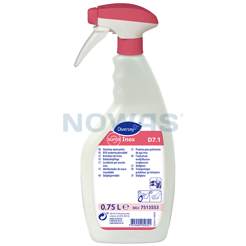 Suma Inox D7.1 er et pleiemiddel klart til bruk på rustfrie ståloverflater som ikke brukes i forbindelse med næringsmidler. Suma Inox D7.1 stålpleiemiddel inneholder spesielle oljer som gir langtidsvirkende beskyttelse og glansfull overflate på rustfritt stål, for eksempel utvendig på kjøleskap, dypfrysere, ismaskiner, oppvaskmaskiner og andre flater av rustfritt stål.