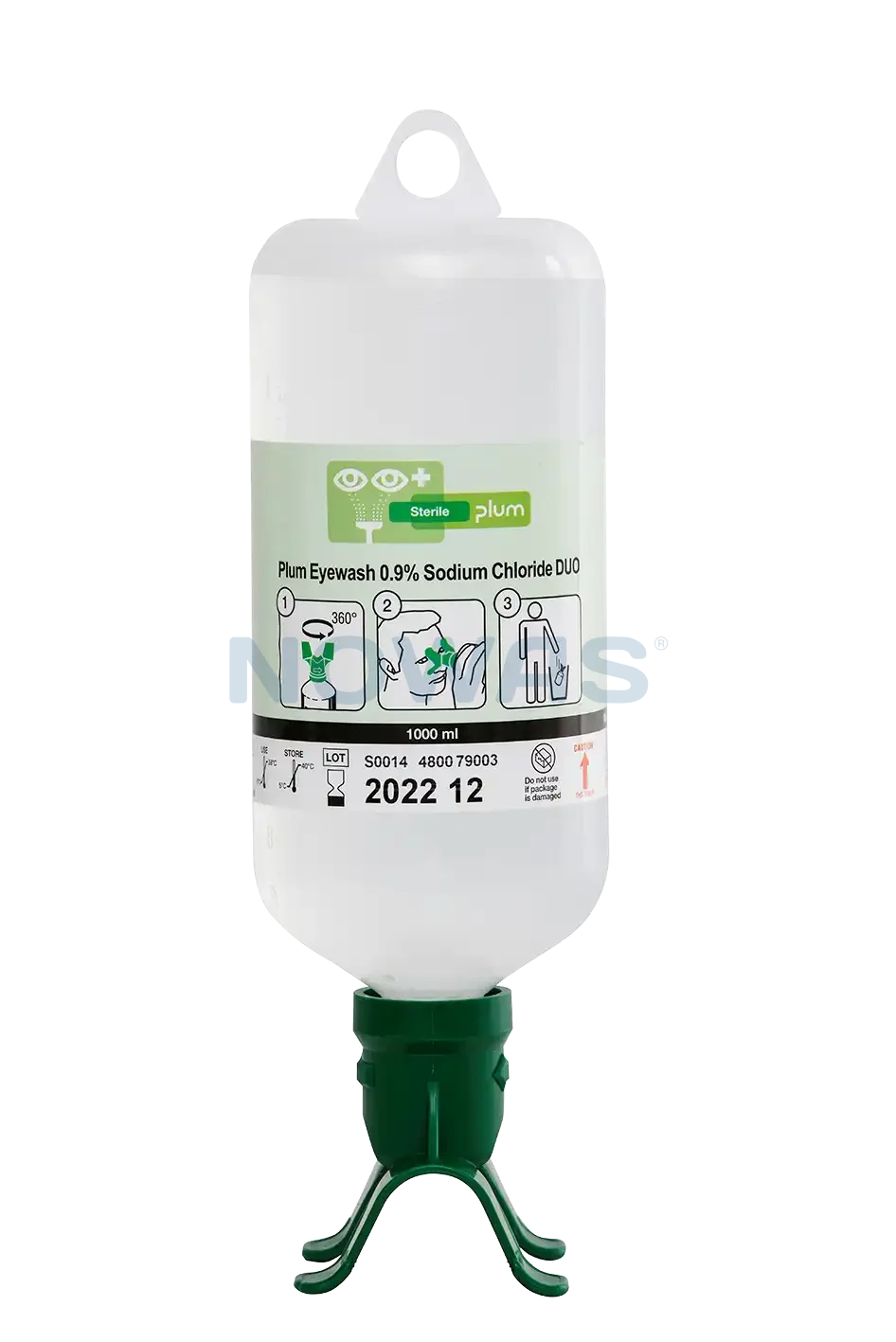Øyeskyll med Duo øyekopp, som gjør det mulig å skylle begge øynene samtidig. Ergonomiske øyekopper gir en effektiv væskestrøm. Inneholder 0,9 % sterilt natriumklorid og brukes til å skylle øynene ved ulykker med fremmedlegemer, støv og smuss. Det er en engangsflaske som ikke kan etterfylles.