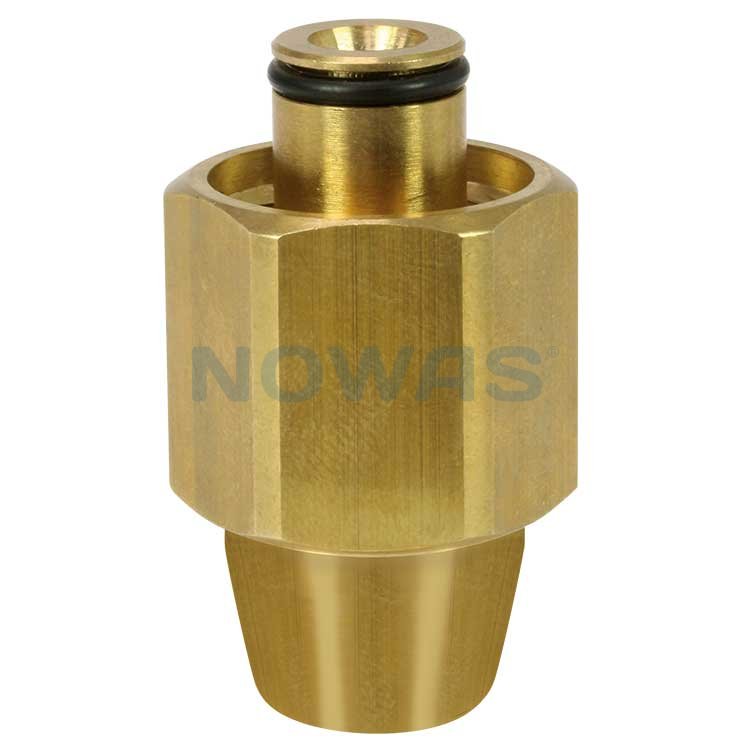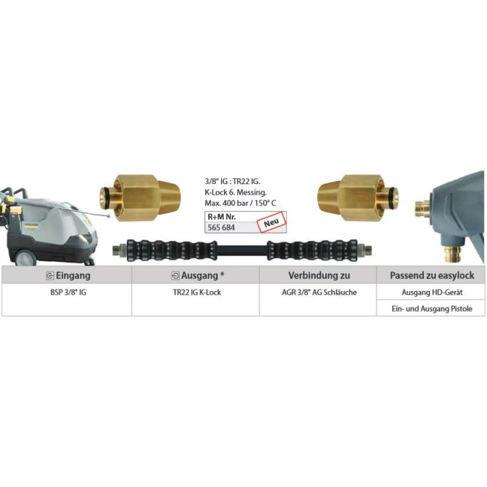 Denne adapteren kobler en høytrykksmaskin eller -pistol med trapesformede gjenger til en standard høytrykksslange med 3/8" gjenger.