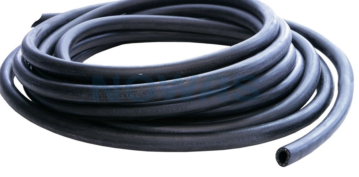 Lavtrykkslange med svart overflate og interiør. Industriell versjon for vann og trykkluft. Slitasje- og ozon motstandsdyktig.