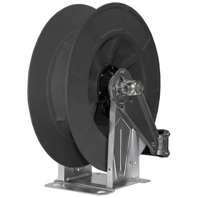 Robust og pålitelig slangeoppruller for profesjonell bruk, laget av en kombinasjon av rustfritt stål og slagfast svart plast.