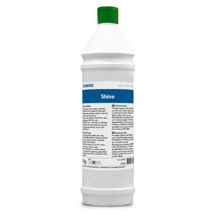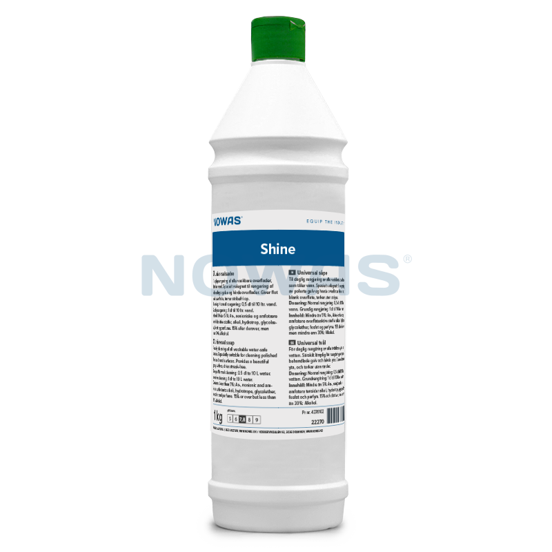 Shine Universal er et effektivt rengjøringsmiddel for daglig rengjøring av alle vaskbare, skinnende, blanke og harde overflater som tåler vann. Shine er et konsentrert nøytralt universalmiddel, som med sine effektive rengjøringsegenskaper sikrer bevaring og forlengelse av overflatens opprinnelige glans, uten å legge til et ekstra pleiesjikt.