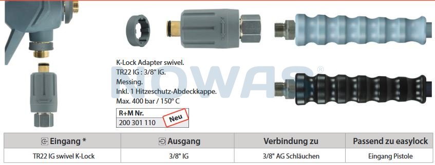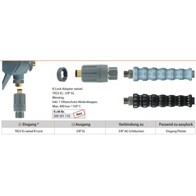 Denne svivelen brukes til å koble en høytrykkspistol med trapesformede gjenger til en høytrykksslange med M22-gjenger.