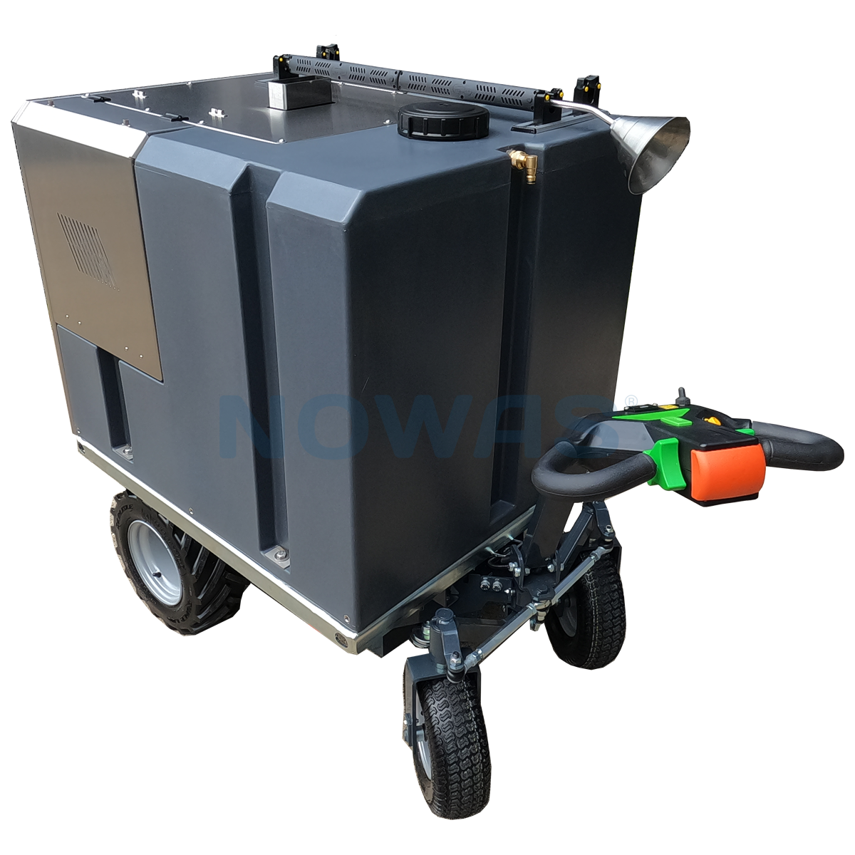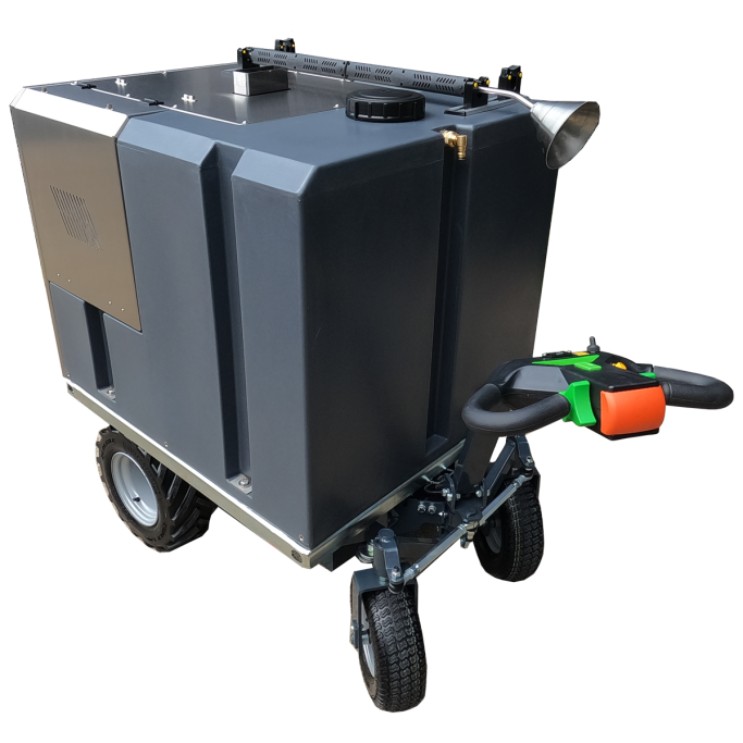 X-WEED E2-modellen er batteridrevet og kan monteres på nesten alle typer kjøretøy eller tilhengere. Den bruker avansert litiumbatteriteknologi, som gir nok strøm til omtrent fire fulle vanntanker på én lading. Perfekt for effektiv ugressbekjempelse med høy mobilitet og lav driftsstøy.