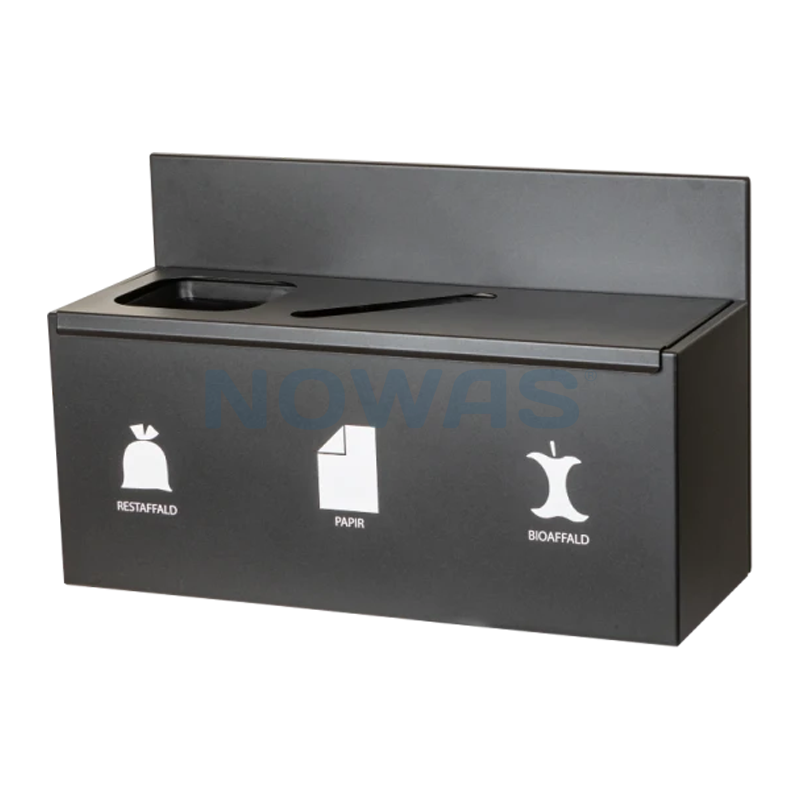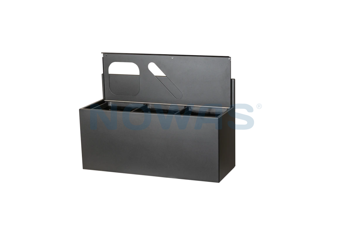 Avfallssortering fra Tina Trolleys. Vegghengt kildesortering for 3 fraksjoner. I lokket er det en avfallsbeholder, en papirkasse i midten og et lukket lokk i den siste delen.