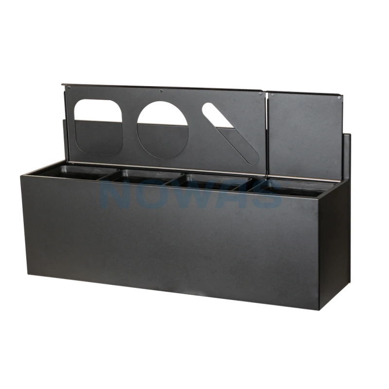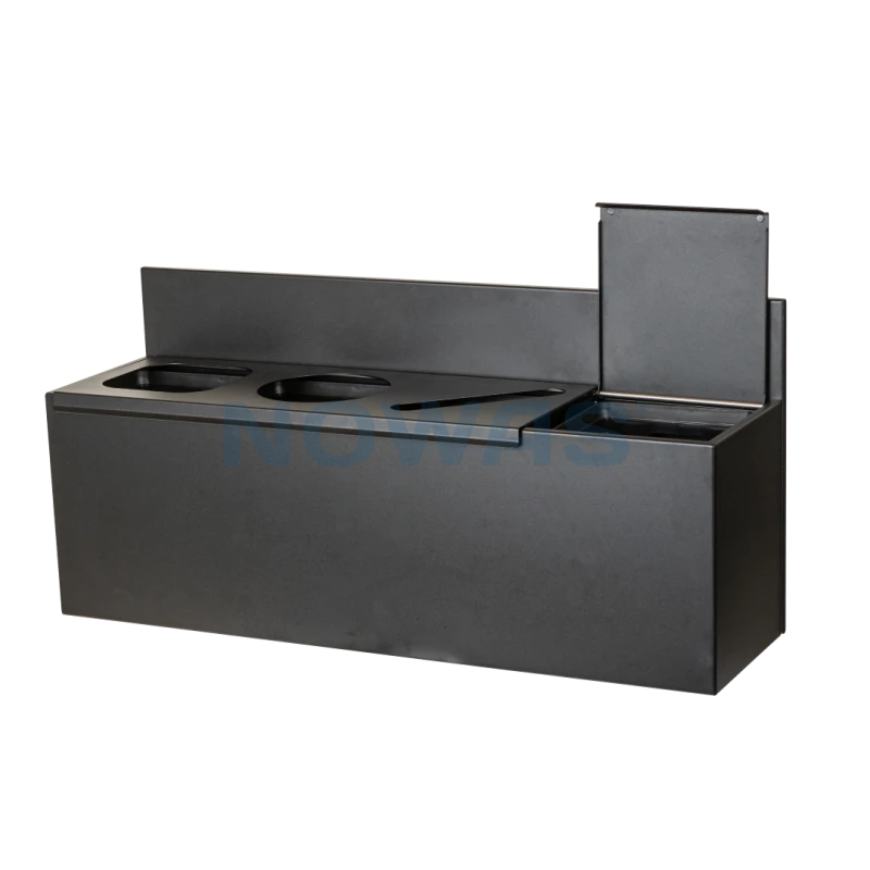 Avfallssortering fra Tina Trolleys. Vegghengt kildesortering for 4 fraksjoner. Lokket til beholderen er todelt, med 3 fraksjoner på den ene siden og 1 på den andre, delt i åpen innmating, rund mating, papirmating og lukket lokk. Stativet er inkludert4 stk. 15 liters bøtter, produsert i resirkulert plast.