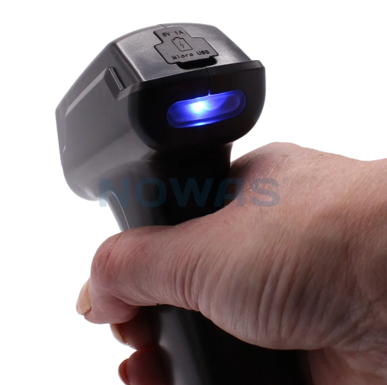 - Blått lys indikerer tilstrekkelig batteri, rødt lys betyr at lading må lades