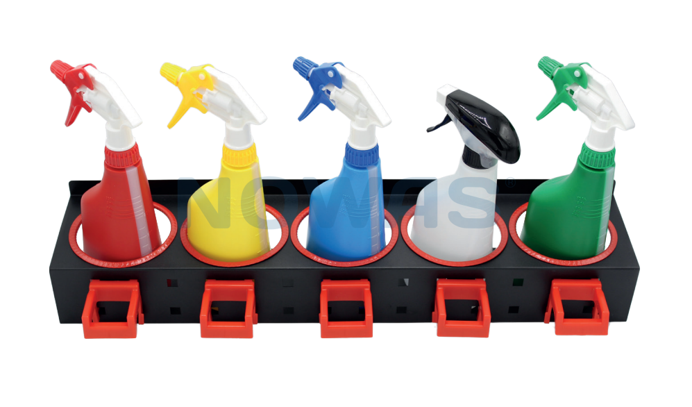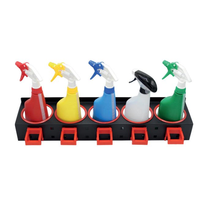 Stativet har 5 hull hvor du kan sette inn sprayflaskene dine. I tillegg er det også 5 klips hvor du kan henge opp 5 sprayflasker.